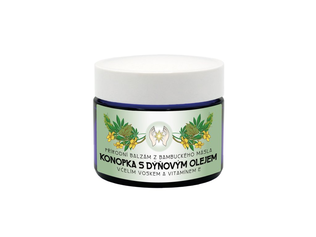 Přírodní balzám z bambuckého másla s konopným olejem LZS a dýňovým olejem LZS, včelím voskem a vitaminem E. Nově varianta v modrém skle :-)