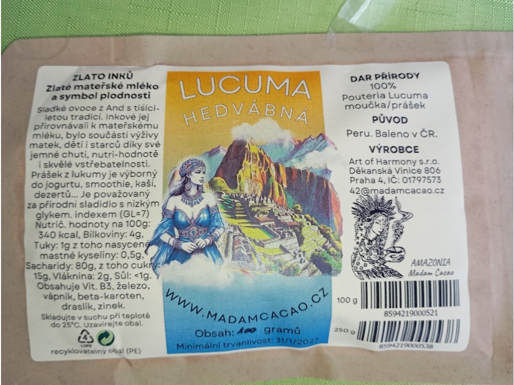 Balení 100 g lucumy odpovídá 400 g čerstvého ovoce Pouteria lucuma.