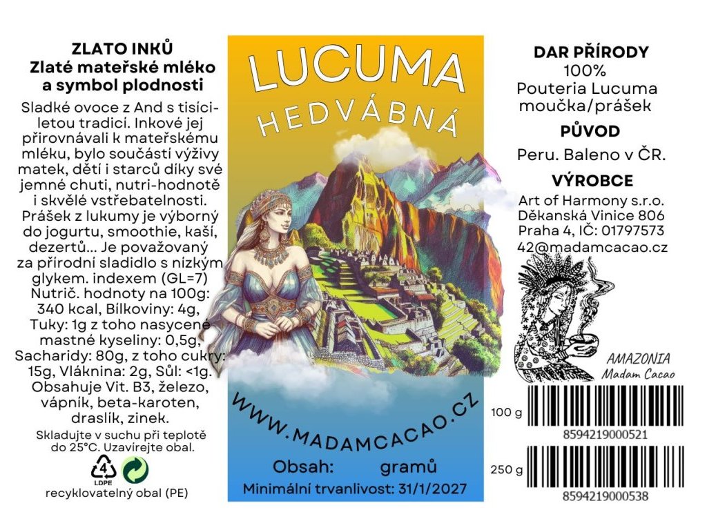 Lucuma je strom dorůstající výšky až 10 m. Jeho domovinou jsou jihoamerická údolí And, která zasahují do dnešních států Chile, Ekvádoru a Peru. Fytoterapeuticky využitelnou částí je kulatý zelený plod, který má velmi suchou dužinu charakteristické chuti, připomíná chuť javoru a sladkých brambor. Toto ovoce obsahuje velmi vysoké procento vitamínů, minerálů a stopových prvků.