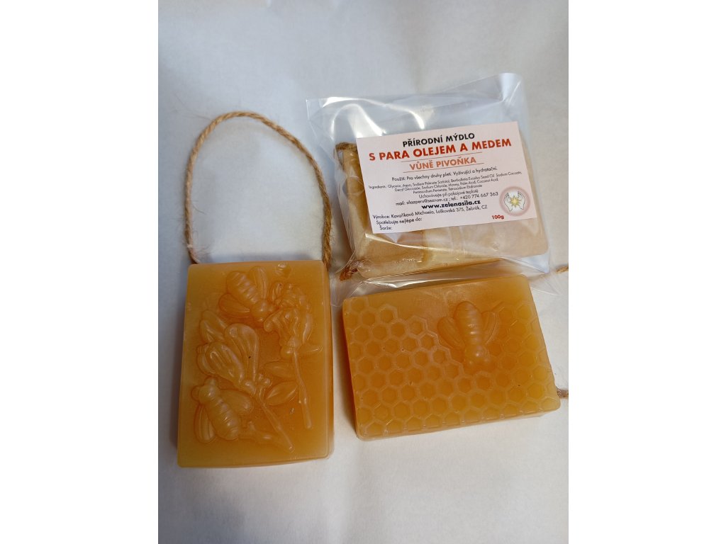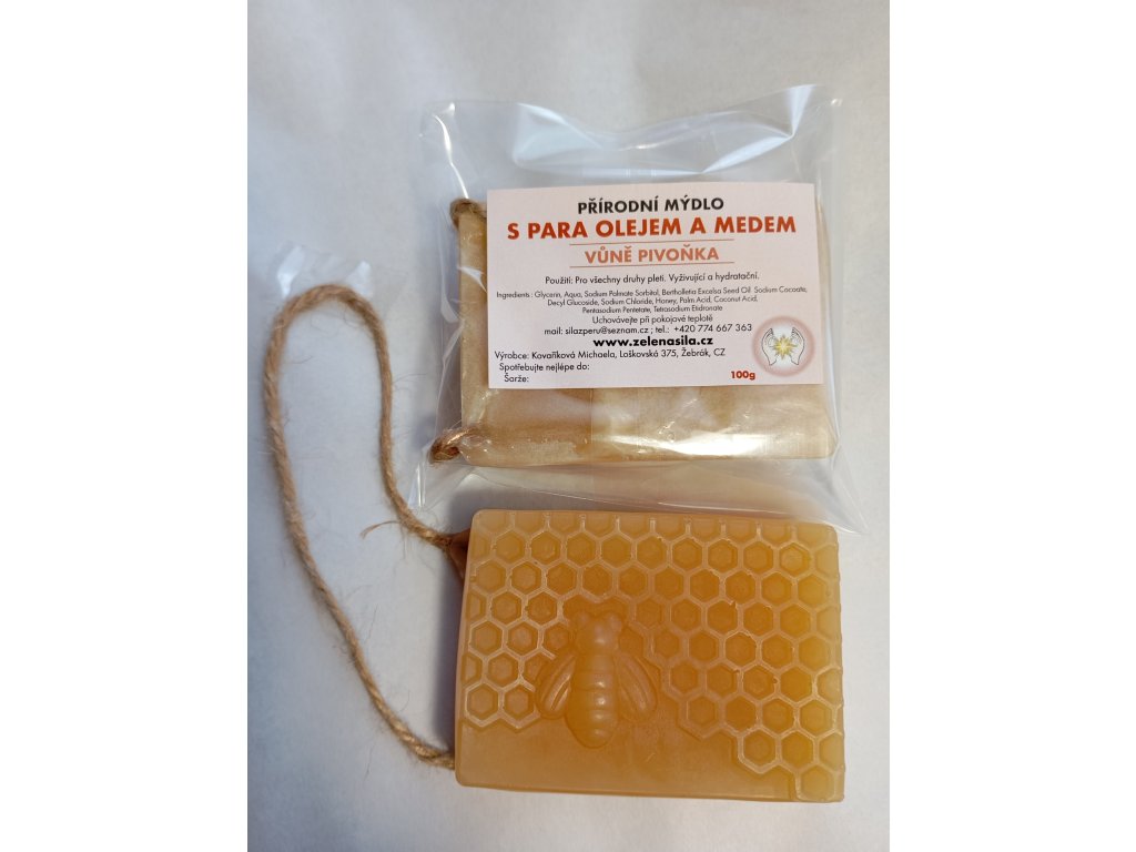 Přírodní mýdlo s para olejem, medem a glycerinem. Tato skvělá kombinace pokožku přirozeně hydratuje a vyživuje.